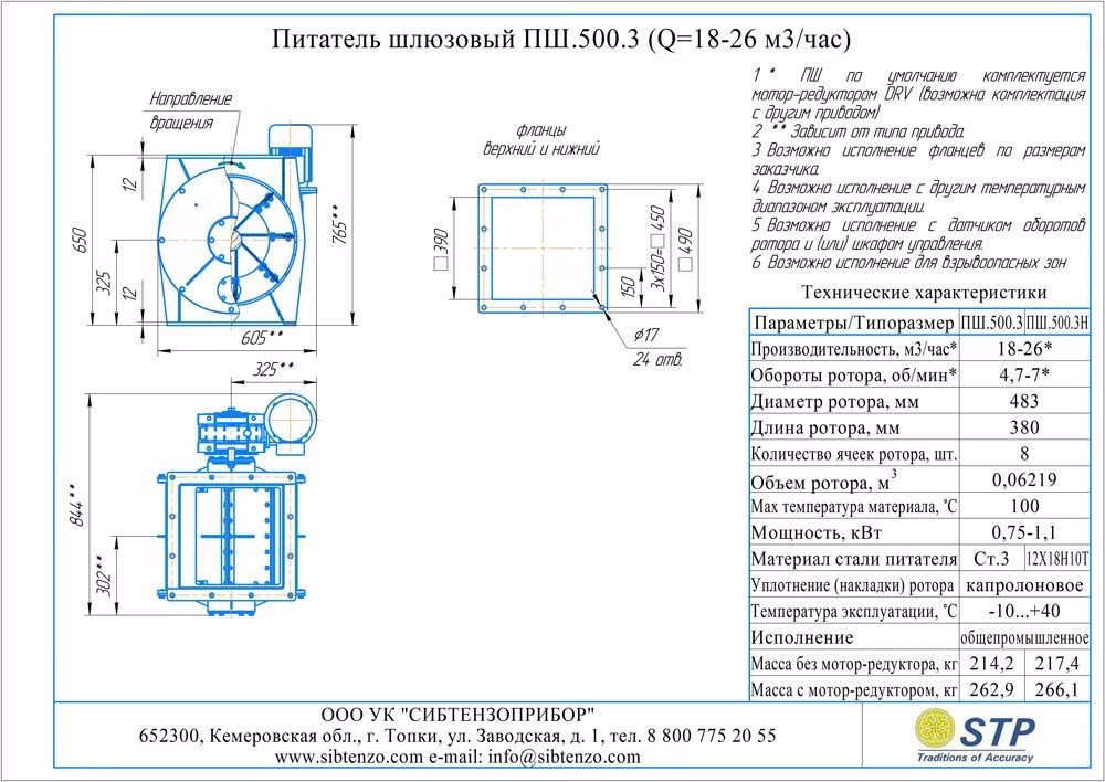 Все сборочные единицы и детали смонтированы в корпусе Питателя Шлюзового ПШ 500.3. Рабочим элементом является ротор, с помощью которого происходит непрерывное (порционное) перемещение материала. Ротор установлен на подшипниковых узлах, которые расположены в крышках.